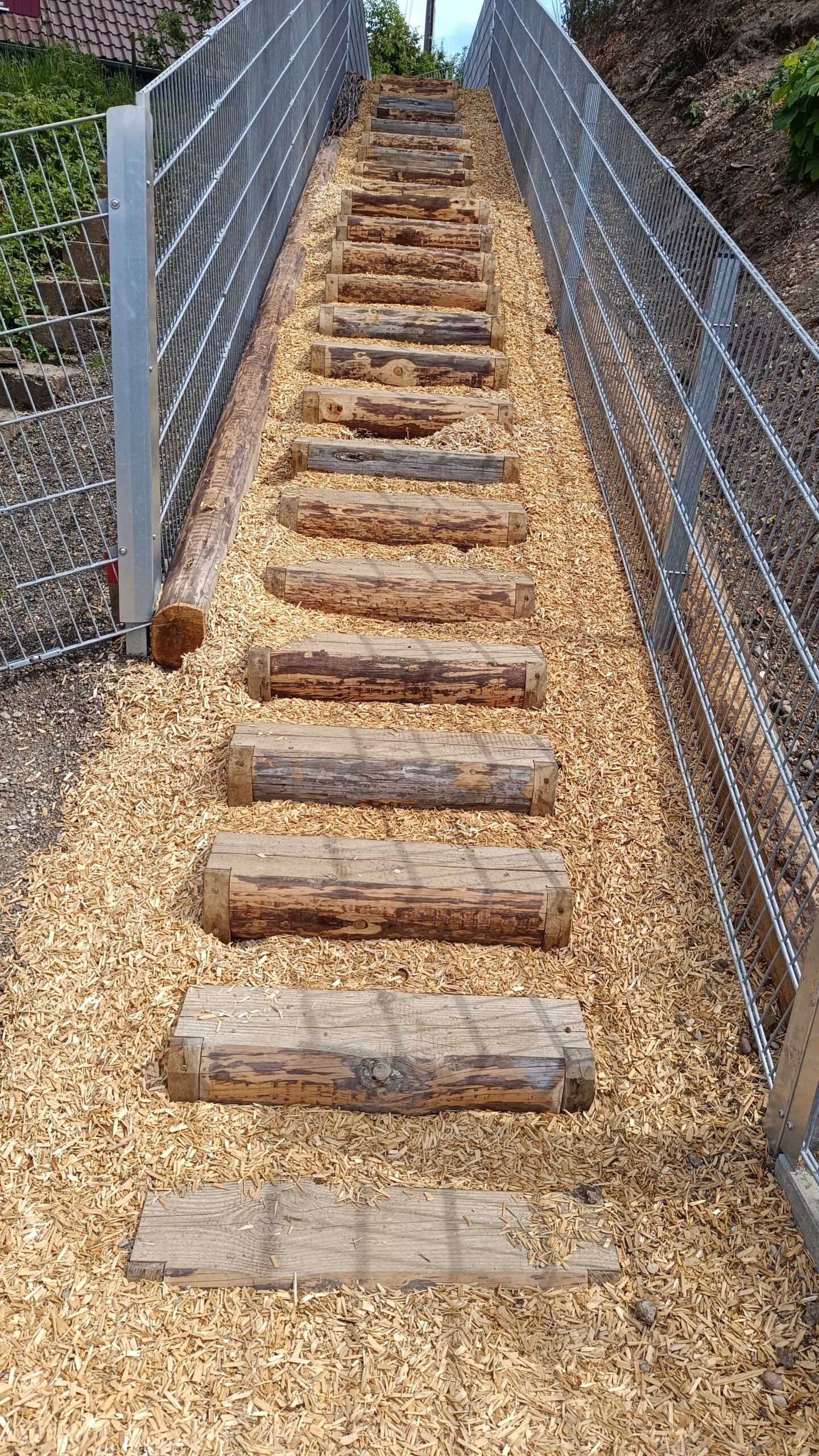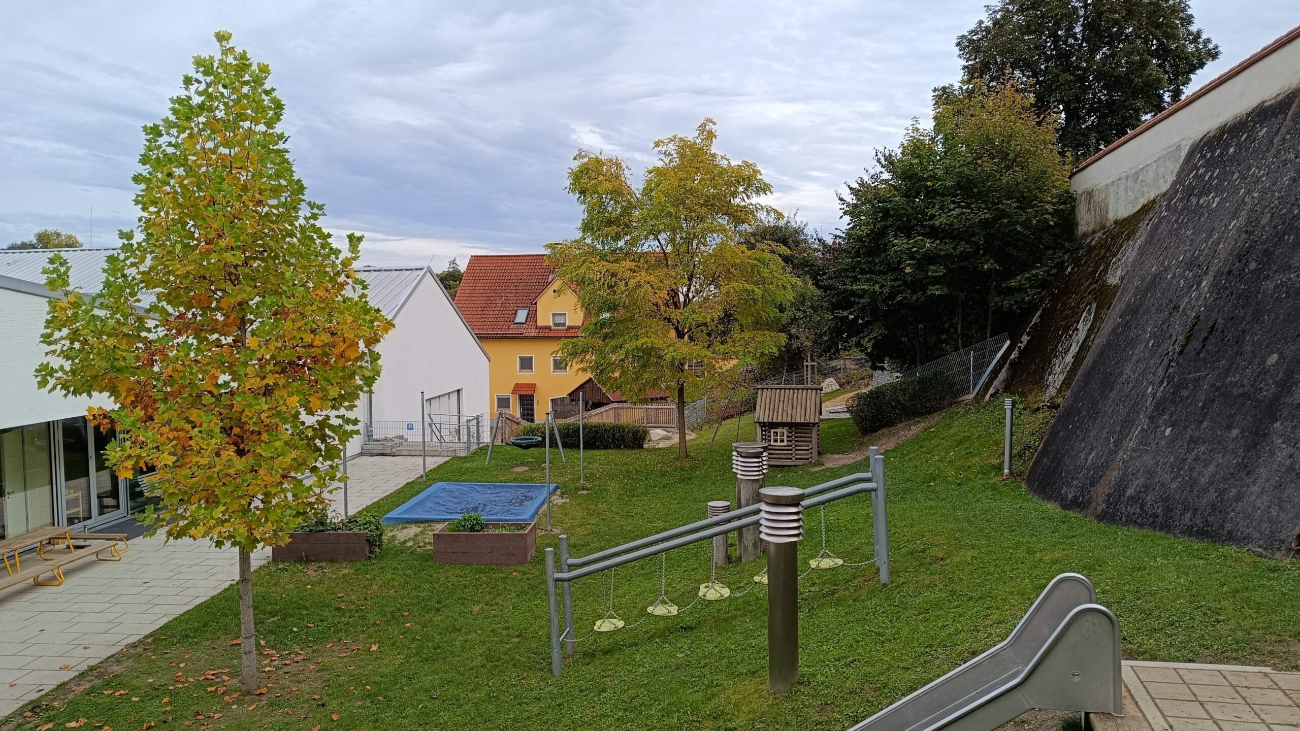 Die Kindertagesstätte im Zentrum von Allmannshofen wurde erweitert, wobei das teilweise steile Geländerelief unterhalb der KITA für den Spiel- und Erlebnisbereich umgestaltet wurde. Die Neuplanung und Ordnung der Spielbereiche berücksichtigt die Bedürfnissen und Anforderungen der Kinder optimal.